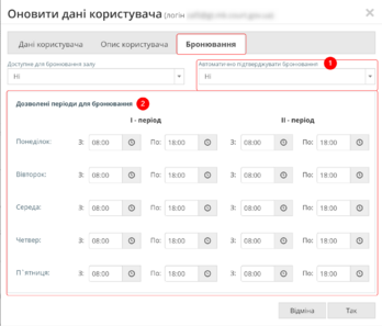 • В службовому кабінеті (довідник користувачів), в картці користувача можливість вказувати доступність власних залів для бронювання іншими судами в розрізі робочих днів тижня (тобто для кожного робочого дня тижня можливо вказати свій графік бронювання).